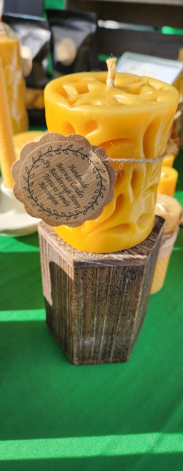 100% Pure beeswax candles burn much slower than other types of candles. Beeswax burns brighter, cleaner and most importantly purifies the air as it burns.
