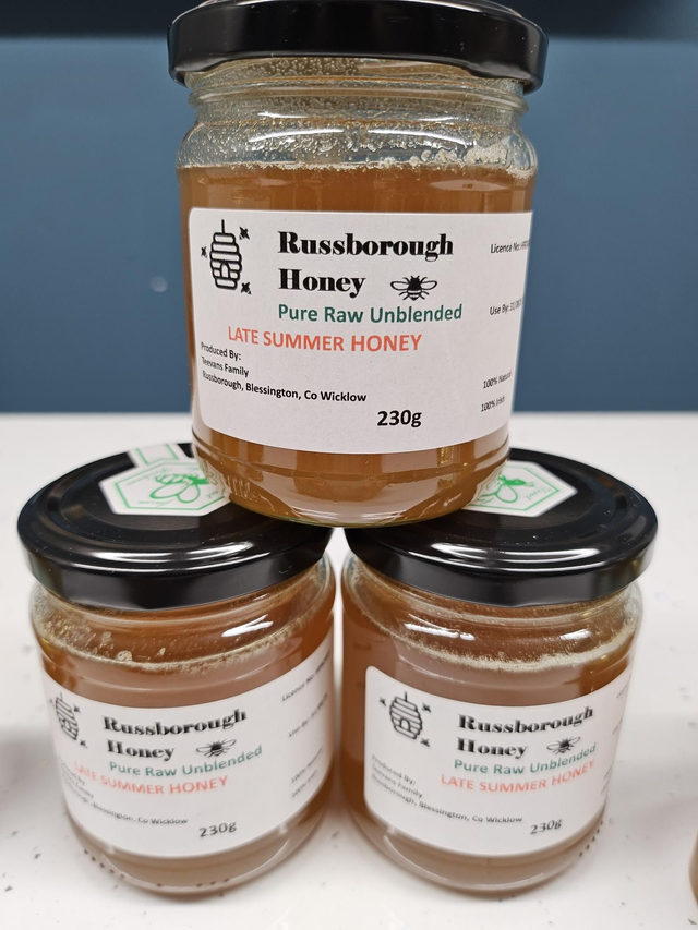Raw Irish Late Summer Blossom Honey which is produced by our Bees in Wicklow & Kildare during the late summer months August/September.